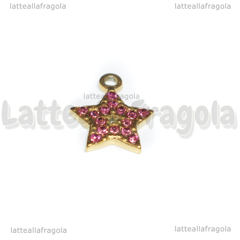 Ciondolo Stella in Acciaio Inox Dorato con pavè di strass rosa 15.5x13mm